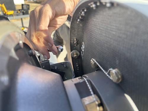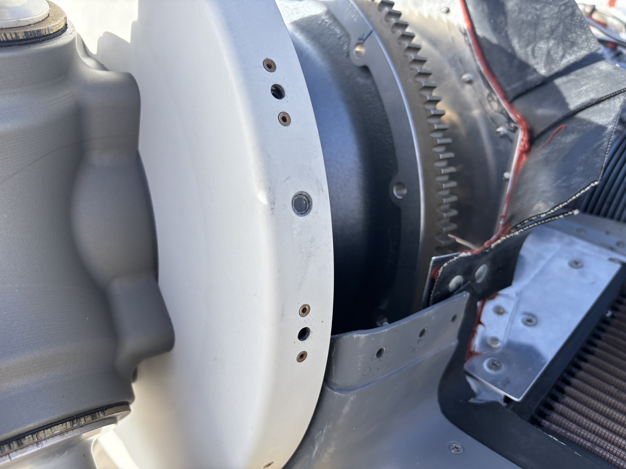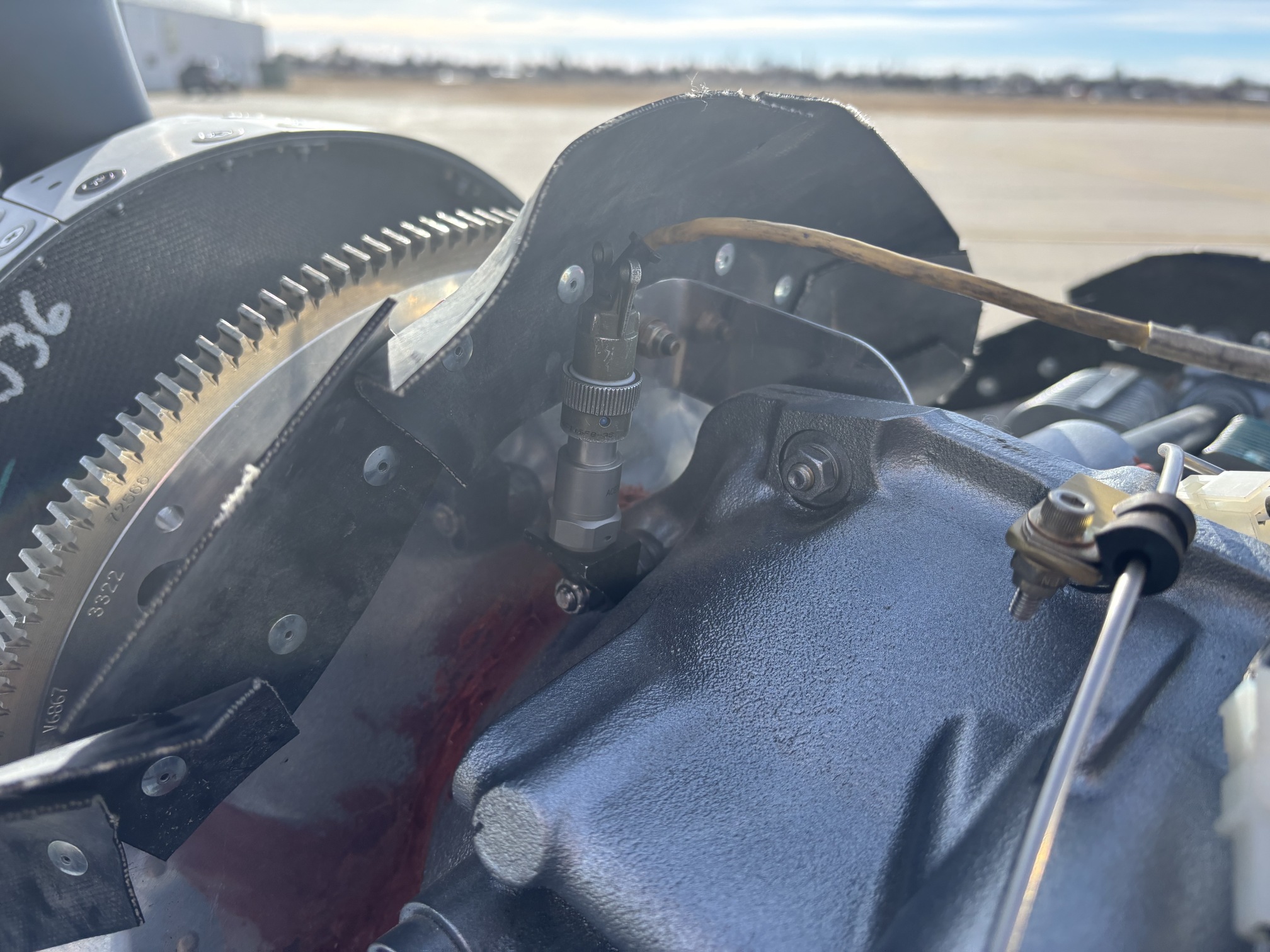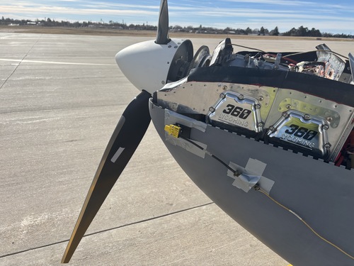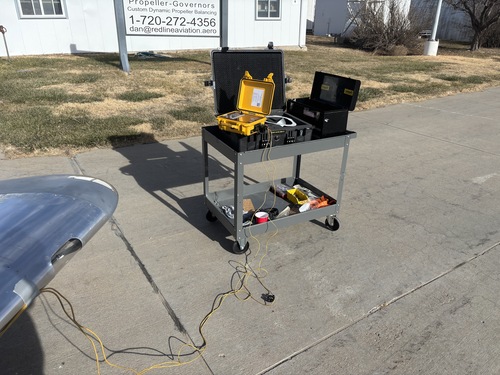 Today, I flew out to KAKO (Akron, CO) to Redline Propeller to have my propeller dynamically balanced. Dan installed a vibration sensor on top of the engine. And then an optical sensor with some reflective tape on one blade of the prop. My prop tested at 0.35 IPS of vibration at 2,000 RPM, which is greater than the 0.2 limit, so it was a good idea to do this. The computer figures out where to add weight and how much is needed. After a couple of rounds of testing, Dan determined that this was the spot for the weight. We removed the spinner and he added a hole to the backplate and countersunk it. Then he added this screw, washers, and nut to the hole. Afterwards, we reinstalled the spinner. Centrifugal force will keep it all pinned against the spinner. It made a big difference. The IPS are now 0.04 and the engine/prop combo feels significantly smoother than it did before. Well worth the money!